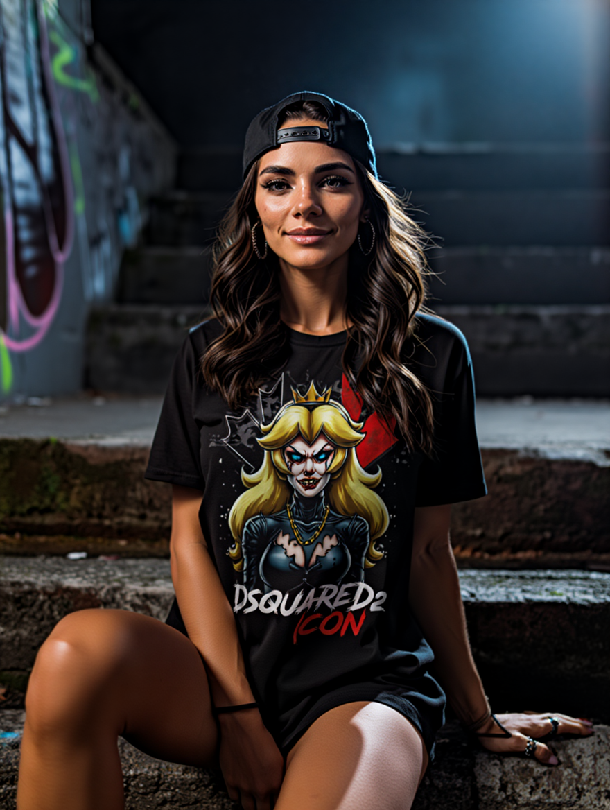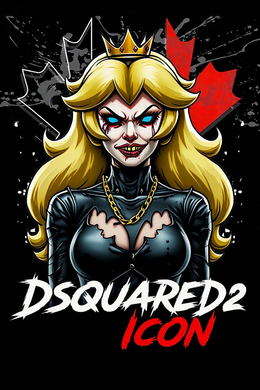 Un diseño atrevido, rompedor y con un aire siniestro, donde el estilo urbano de Dsquared2 se fusiona con la icónica Princesa Peach de Mario, reinventada como una auténtica villana del streetwear.