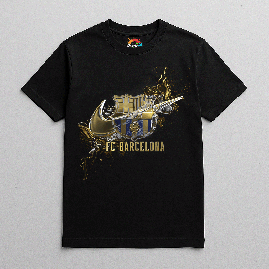 Una pieza única para los verdaderos amantes del fútbol y del estilo urbano. Esta camiseta combina el negro clásico con un diseño en oro líquido y cromo metálico, creando un efecto visual potente y elegante. En el centro, el escudo del F.C. Barcelona resplandece junto al swoosh fluido, dando la sensación de energía en movimiento y poder.
