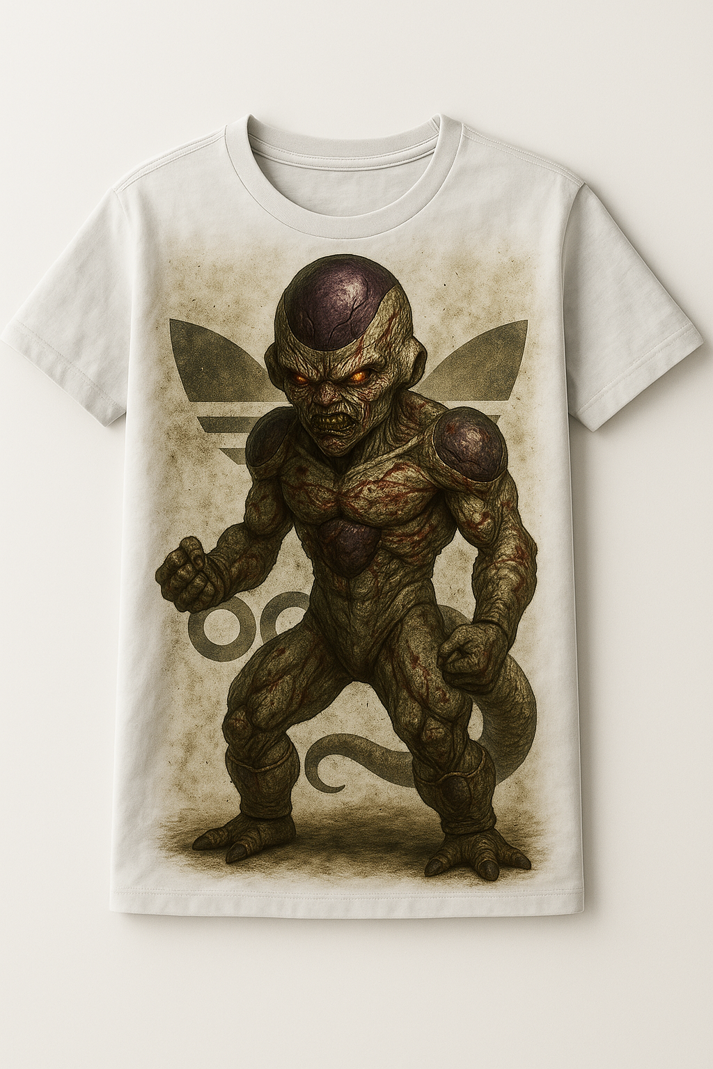 El estampado muestra a Freezer transformado en zombi, con su piel desgastada, venas marcadas y un gesto lleno de maldad. Sus ojos brillan en un tono rojizo que transmite puro terror, mientras su cuerpo musculoso y su cola lo hacen reconocible al instante. El fondo con el logo vintage Adidas aporta un toque streetwear urbano, ideal para quienes buscan una prenda con personalidad y fuerza.
