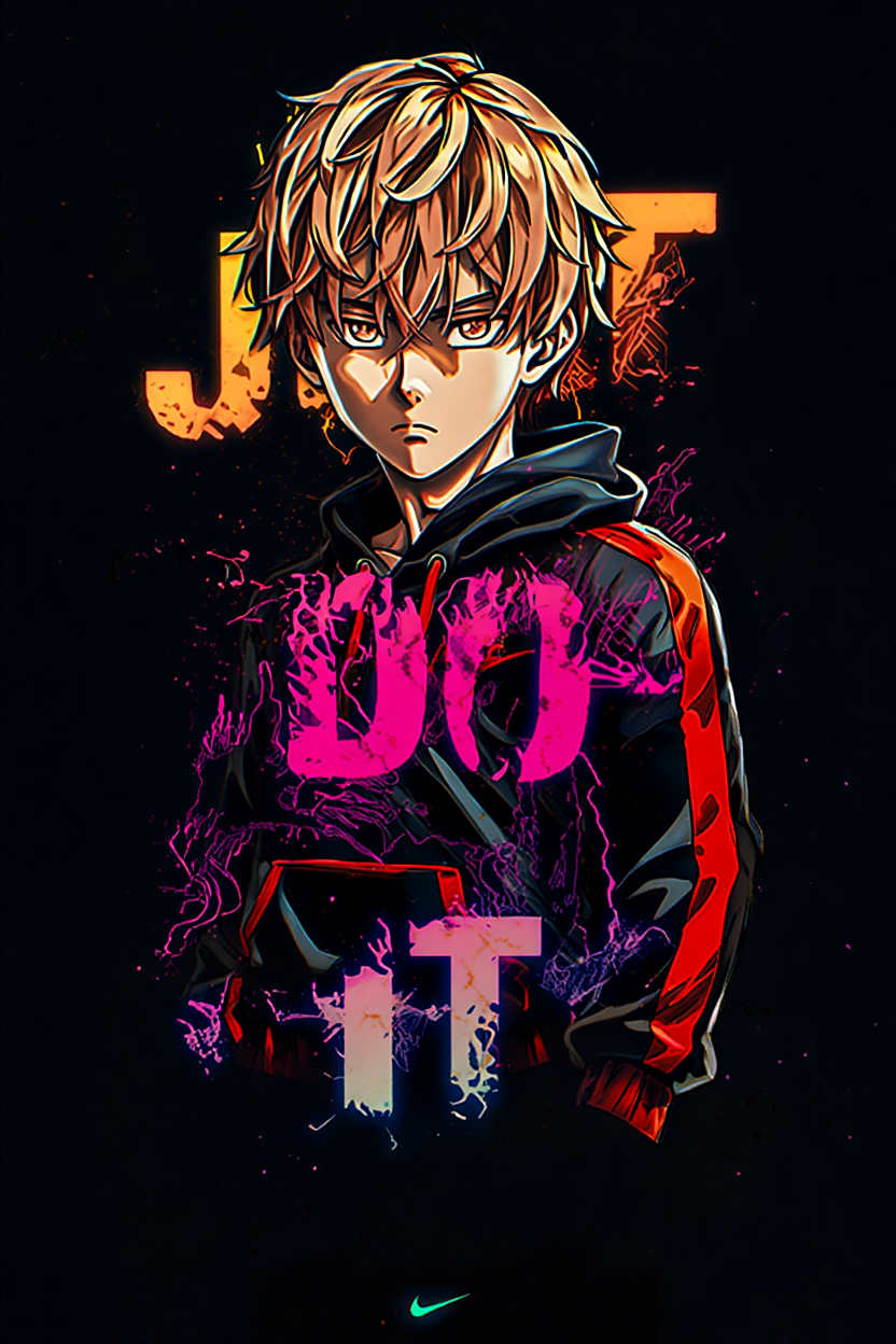Un diseño que mezcla el poder futurista de Genos con la fuerza del lema más icónico del streetwear. El héroe cíborg aparece en primer plano con una expresión seria y decidida, reflejando toda la intensidad y frialdad que lo caracteriza.