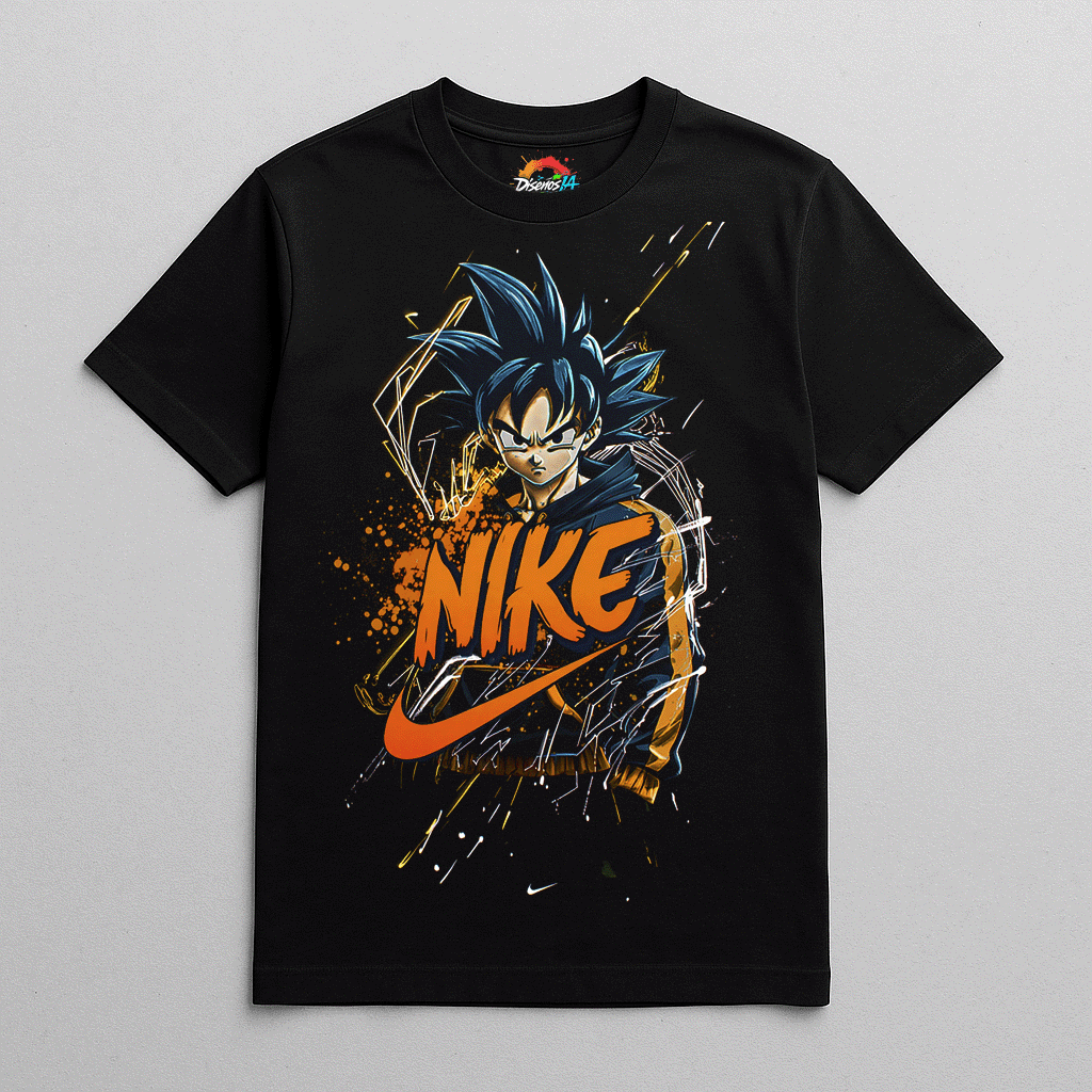 En el centro, el logotipo NIKE en naranja vibrante se superpone al aura eléctrica azul de Goku, creando un contraste visual explosivo que transmite fuerza, velocidad y actitud. La pose desafiante, junto con los efectos de energía en tonos luminosos, convierten esta prenda en un auténtico manifiesto de poder y rebeldía.