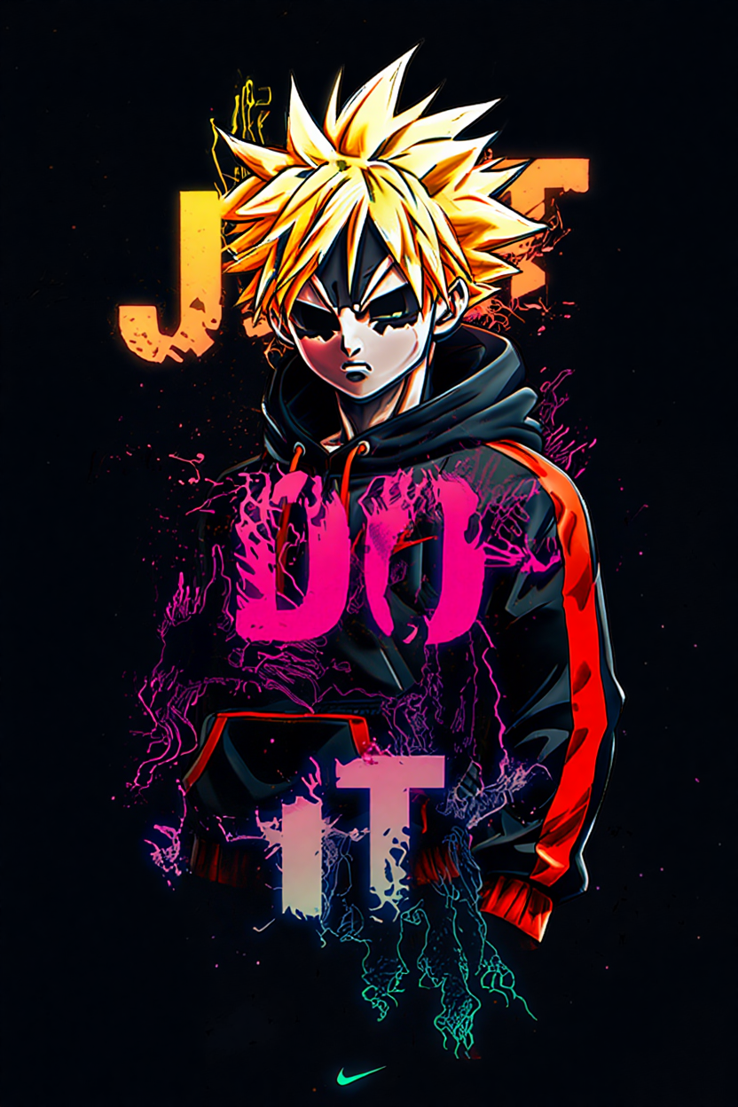El joven guerrero más travieso y poderoso del universo Dragon Ball, Gotenks, llega con este diseño cargado de estilo y energía. Su cabello dorado en Super Saiyan resalta junto al lema “JUST DO IT” en tonos neón, creando un contraste brutal con el fondo oscuro y el efecto urbano de la prenda.