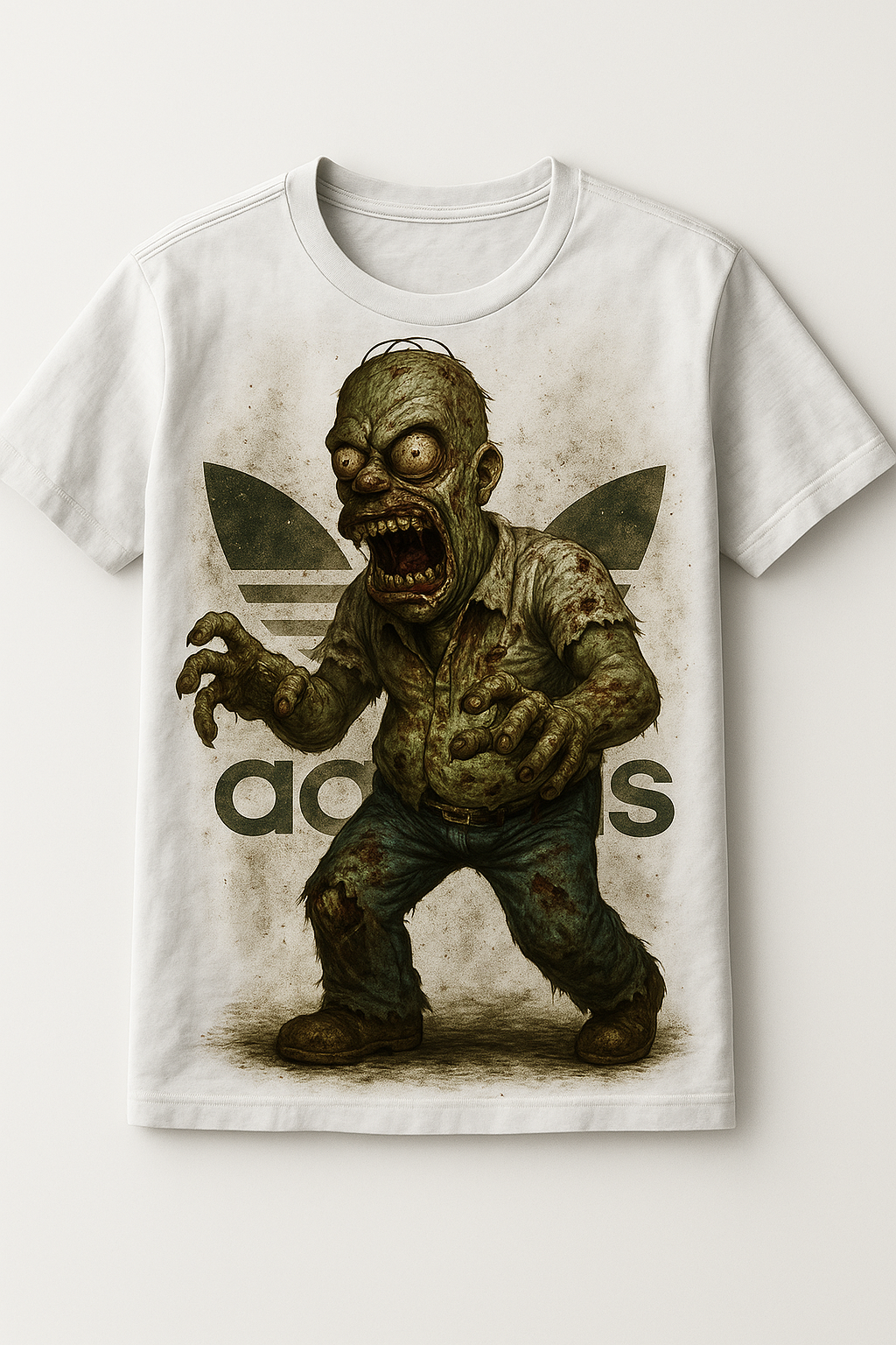 El estampado muestra a Homero convertido en un zombi, con piel verdosa, ropa destrozada y una expresión desquiciada que lo convierte en una prenda perfecta para los amantes de la moda alternativa y el estilo urbano. De fondo, aparece el icónico logotipo vintage de Adidas, aportando ese toque streetwear que refuerza la originalidad del diseño.