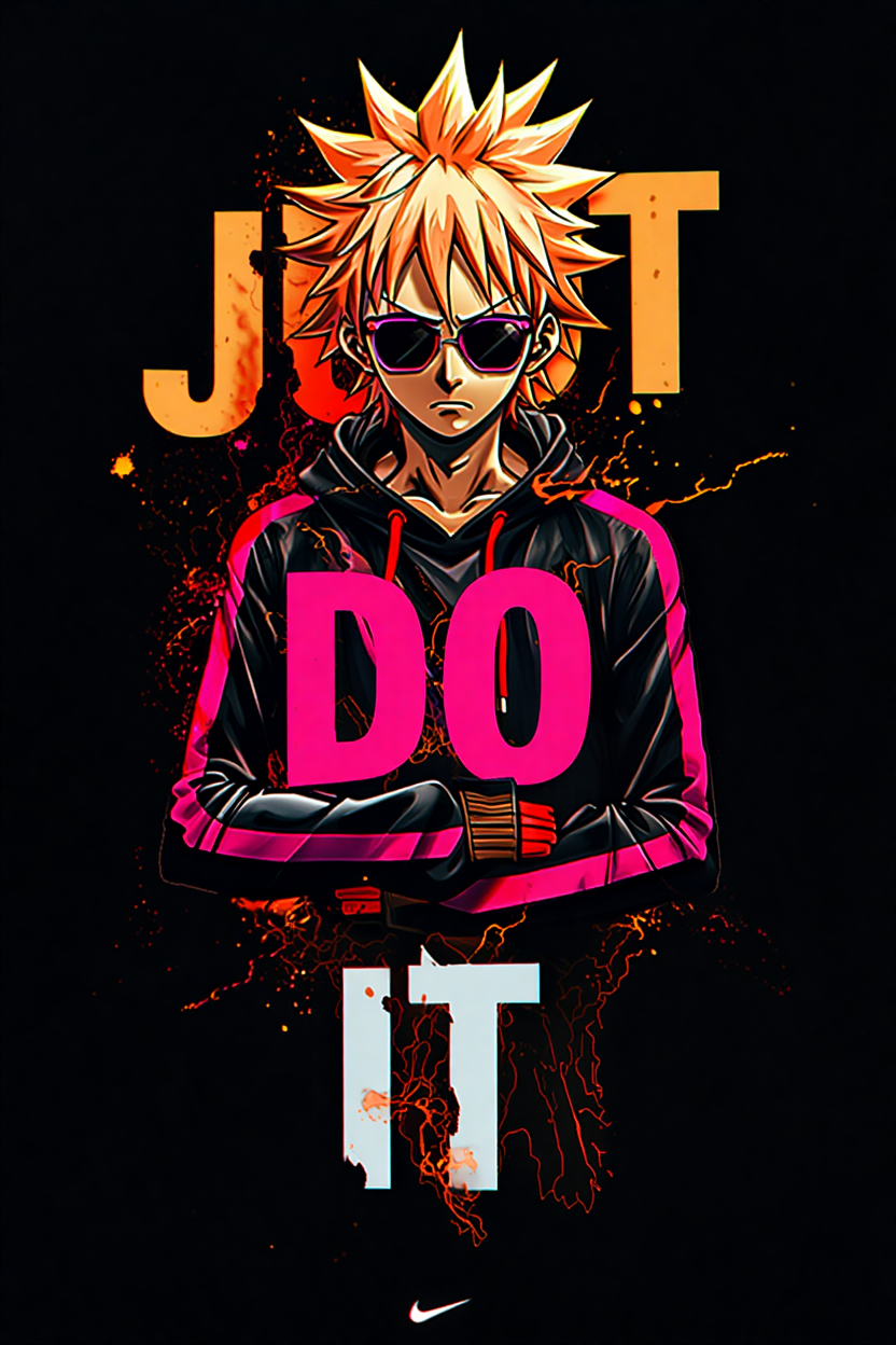 El personaje viste una sudadera negra con detalles en fucsia eléctrico, un guiño directo al estilo urbano moderno y agresivo. En el centro destaca el lema “JUST DO IT”, plasmado en letras desgarradas y enérgicas, con un degradado de tonos rosa y naranja que parecen vibrar con poder. El fondo añade efectos de chispas y salpicaduras que transmiten fuerza y dinamismo, como si Ichigo estuviera a punto de desatar todo su poder espiritual.