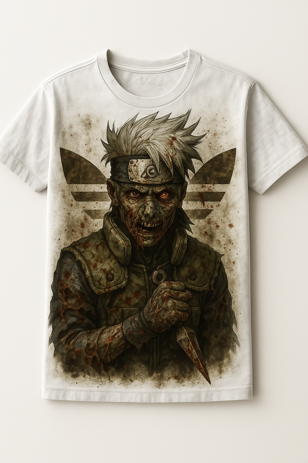 El estampado muestra a Kakashi Hatake convertido en zombi, con piel desgastada, expresión siniestra y su característico cabello plateado despeinado. Porta la banda ninja de Konoha en la frente y viste su clásico chaleco táctico, ahora manchado y rasgado, mientras sostiene un kunai en la mano, listo para el combate. El fondo con el icónico logo vintage Adidas refuerza el estilo streetwear urbano, perfecto para quienes buscan destacar.