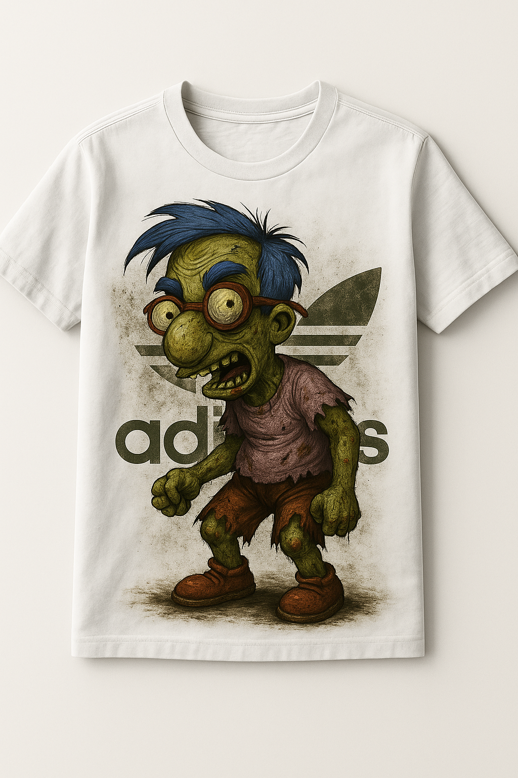 El estampado muestra a Milhouse convertido en zombi, con piel verdosa, cabello azul desordenado y su característico aspecto nerd llevado al extremo: gafas rojas rotas, camiseta y pantalones totalmente desgarrados, y una expresión perturbadora que lo hace único. De fondo, el clásico logotipo vintage Adidas, que refuerza su estética streetwear urbana.