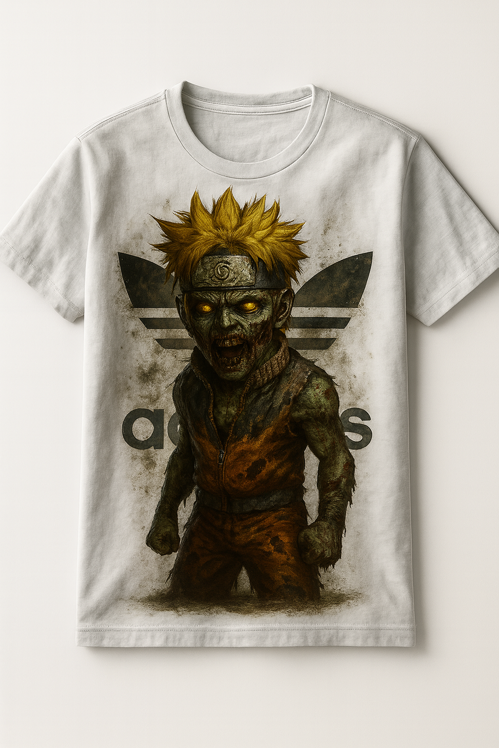 El estampado muestra a Naruto convertido en un zombi, con piel verdosa, mirada encendida y su clásico traje naranja totalmente desgastado y lleno de detalles terroríficos. Su cabello rubio despeinado y la icónica banda ninja de la Aldea de la Hoja completan este diseño único que mezcla el espíritu del anime con una estética urbana y perturbadora. De fondo, el clásico logo vintage Adidas, que aporta un toque streetwear auténtico.
