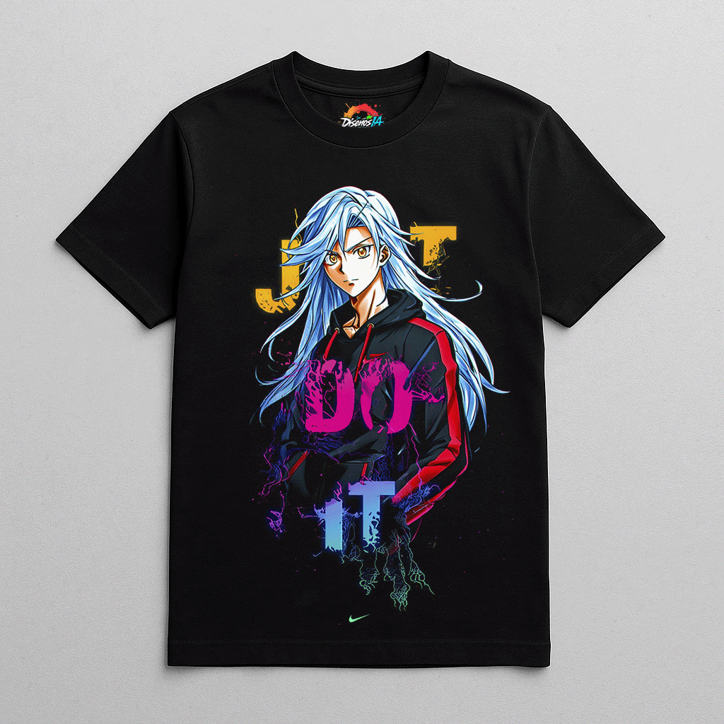 El equilibrio entre calma y poder se refleja en este diseño inspirado en Rimuru, reinterpretado con un estilo urbano y eléctrico. Su cabello azul ondea con energía sobrenatural mientras el eslogan “Just Do It” se fusiona con efectos visuales de pintura y luz, creando una pieza que combina anime, arte digital y cultura streetwear en perfecta armonía.