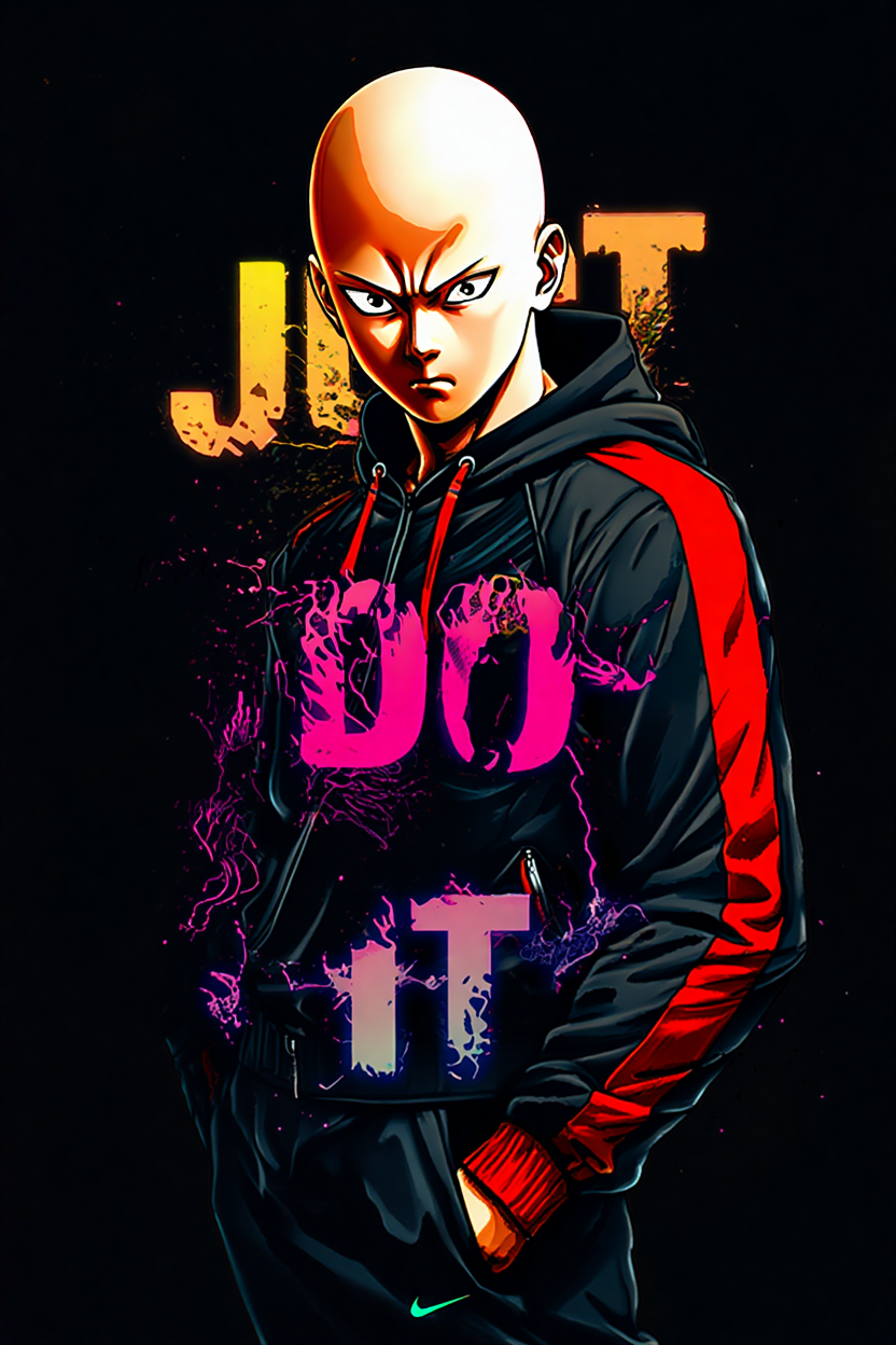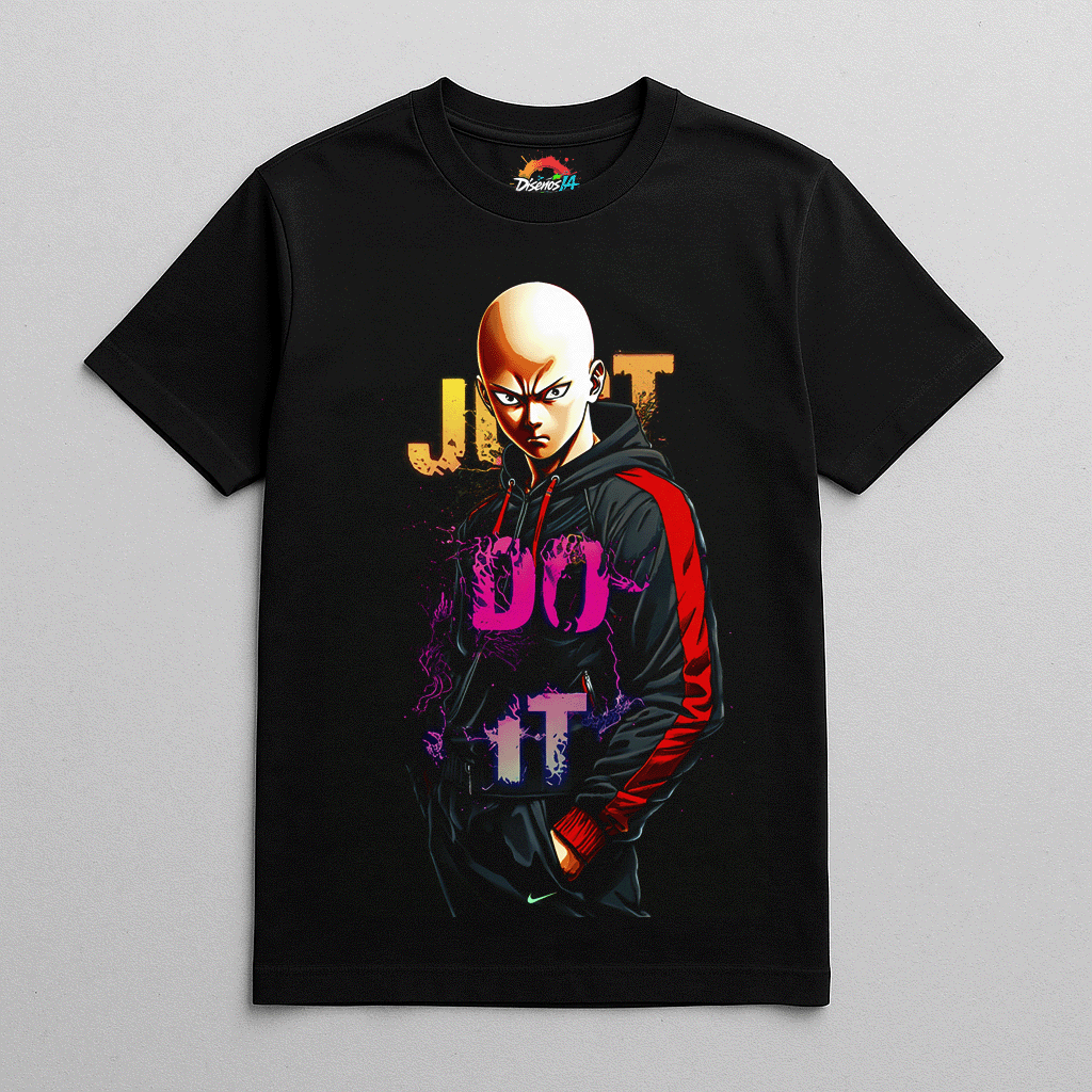El héroe más fuerte del anime, Saitama, también conocido como One Punch Man, llega con este diseño explosivo que mezcla minimalismo, fuerza y estilo urbano. Su icónica expresión seria contrasta con el lema “JUST DO IT” en neón, creando una camiseta única que transmite poder y determinación.