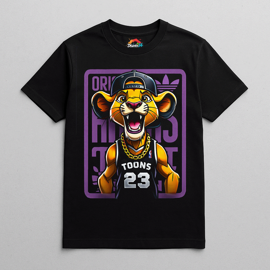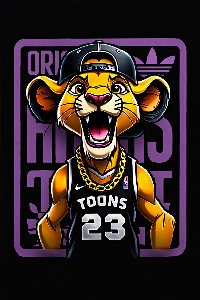 En el diseño central, Simba aparece en versión gangsta con un look totalmente renovado: gorra negra hacia atrás, camiseta de baloncesto Toons 23 y una cadena dorada que refuerza su carácter dominante y seguro. Su expresión desafiante, con la boca abierta rugiendo, transmite poder y energía juvenil.