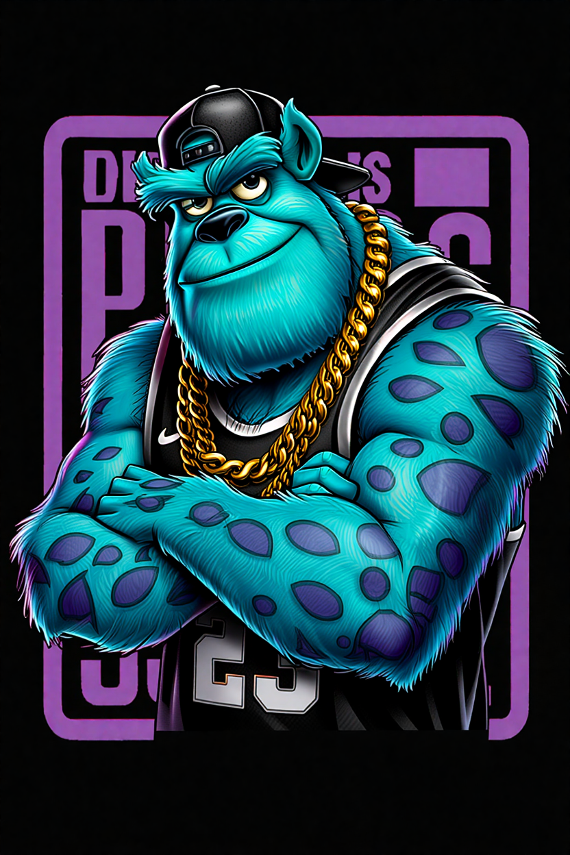 El monstruo más querido de la gran pantalla se transforma en una auténtica leyenda del estilo callejero. Este diseño muestra a Sulley con una actitud desafiante y poderosa, luciendo una cadena dorada y una gorra que refuerzan su aire urbano.