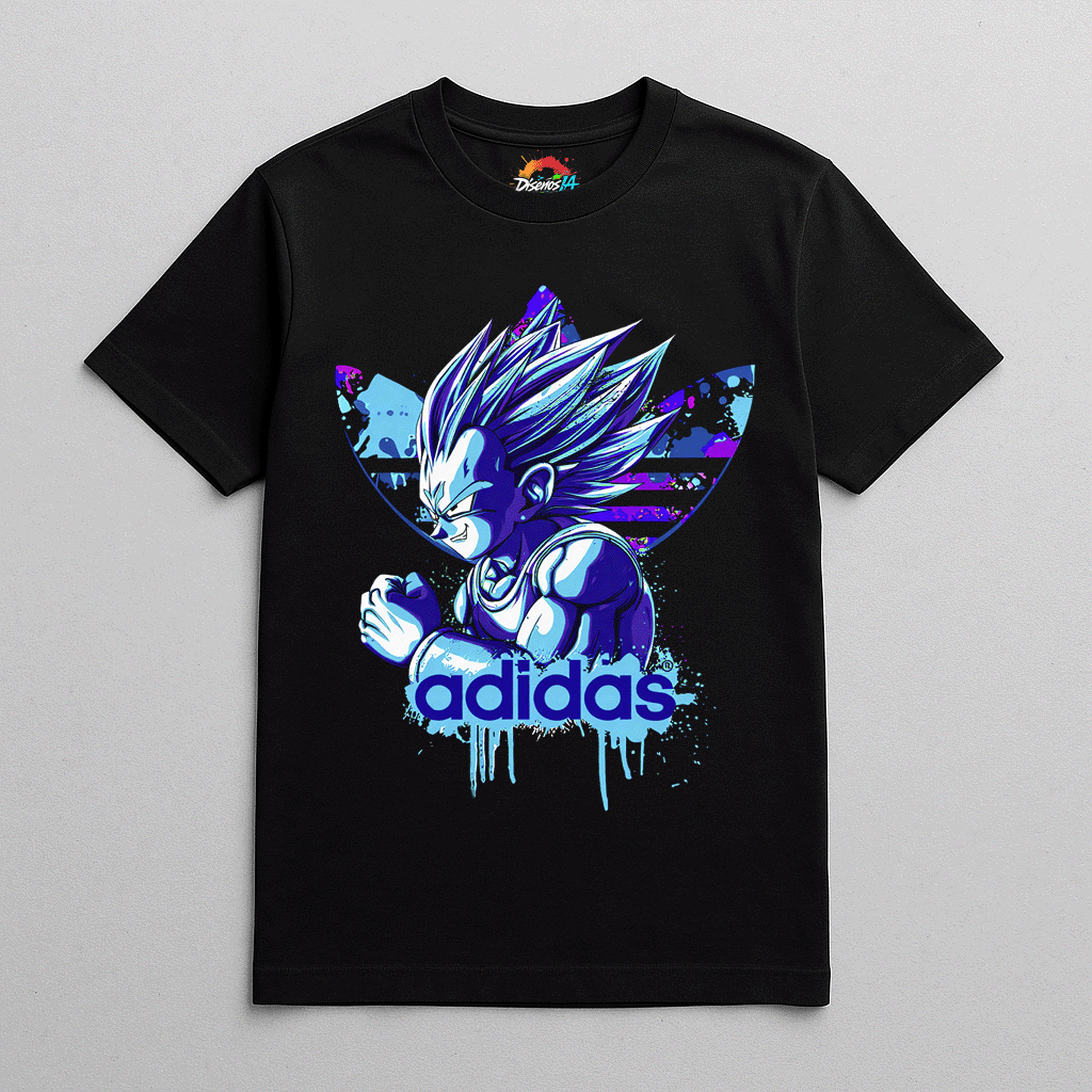 La camiseta Vegeta es una fusión explosiva entre el anime y la moda callejera. Con un diseño vibrante en tonos azules y púrpuras, muestra al príncipe Saiyan en toda su fuerza, rodeado de un estilo grafiti que transmite energía y carácter rebelde.