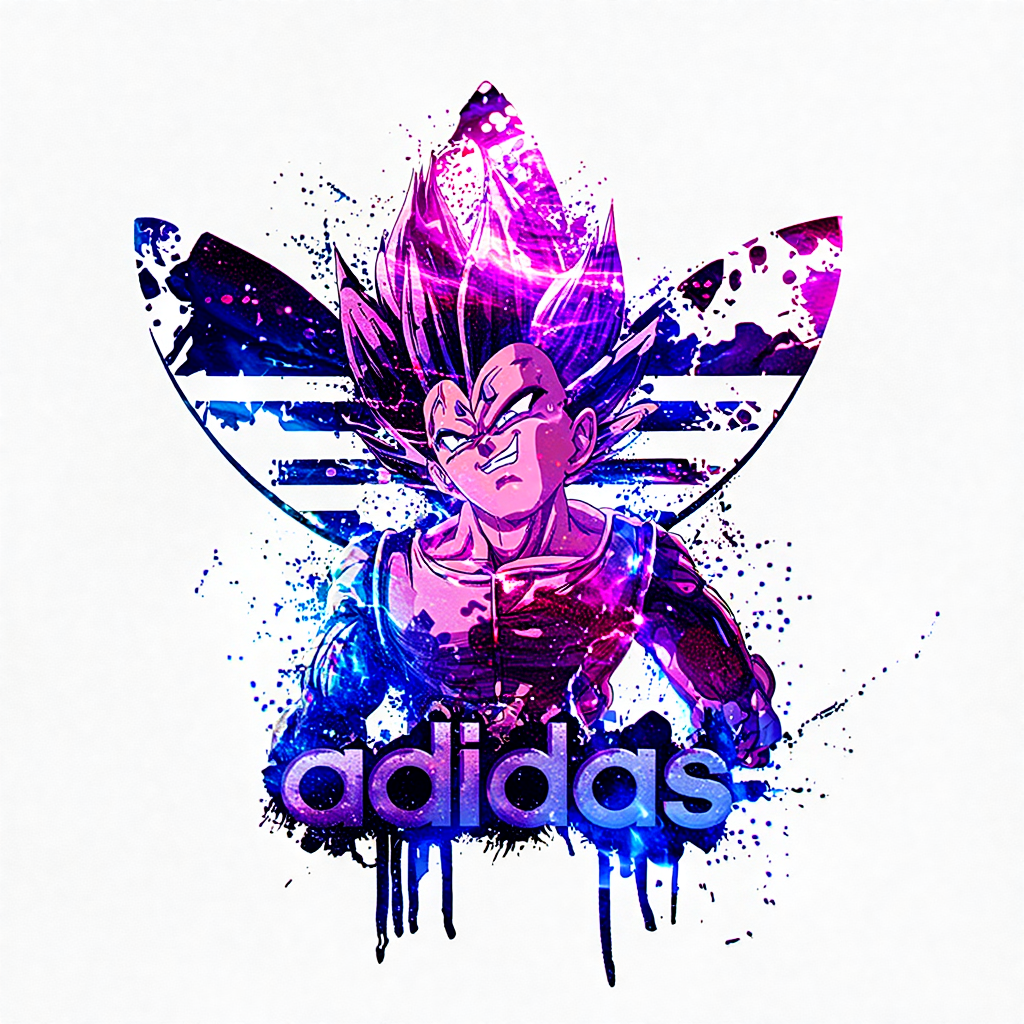 Vegeta, el Príncipe de los Saiyans, llega en una de sus versiones más poderosas y oscuras, fusionando su aura destructiva con la estética urbana de Adidas Originals.